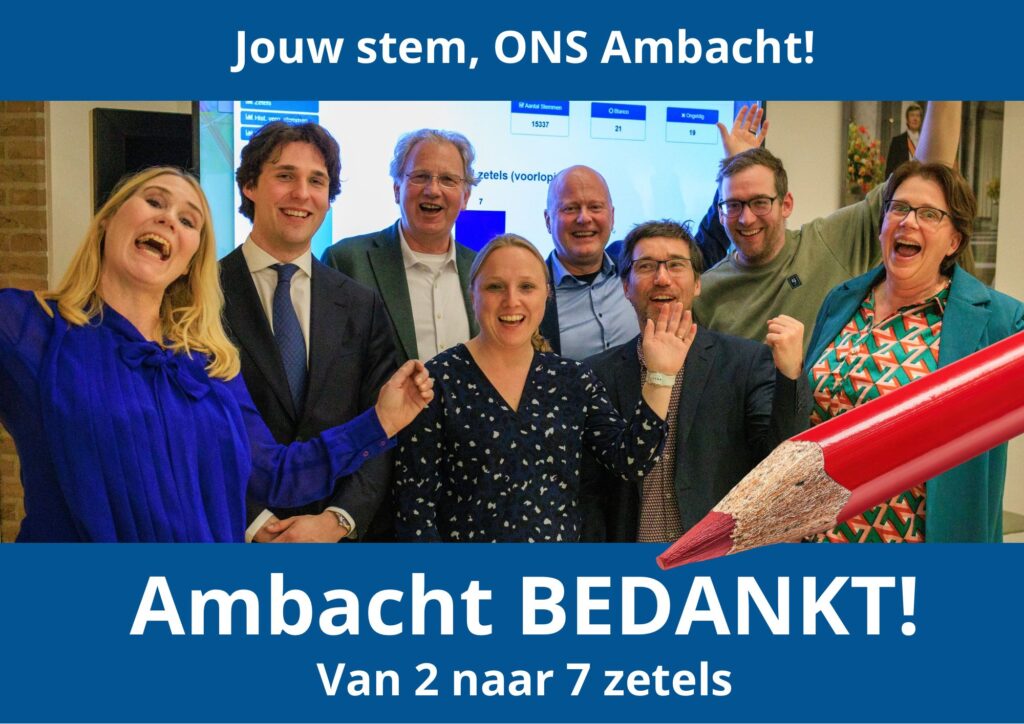 Ambachters hebben de afgelopen jaren gemerkt dat wij anders zijn. We doen niet mee aan politieke spelletjes. We volgen geen ideologie, behalve redelijkheid en eerlijkheid. We zijn kritisch, maar blijven respectvol. We sluiten niemand uit en kunnen met alle andere partijen samenwerken op gebieden waar we het eens zijn.