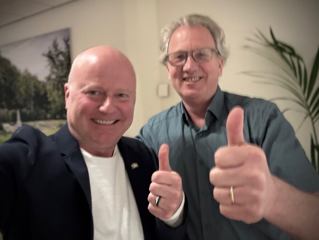 Onze samenwerkingspartners zijn: Gemeente Belangen Hendrik-Ido-Ambacht, de Ambachtse VVD en D66 Hendrik-Ido-Ambacht. Na zeven intensieve, aangename gesprekken gisteren en eergisteren met álle fracties uit de gemeenteraad, was het gisteravond duidelijk voor formateur Oene Doevendans (rechts op de foto) en fractievoorzitter Frank van den Elsen: de duimen konden omhoog voor een selfie!
